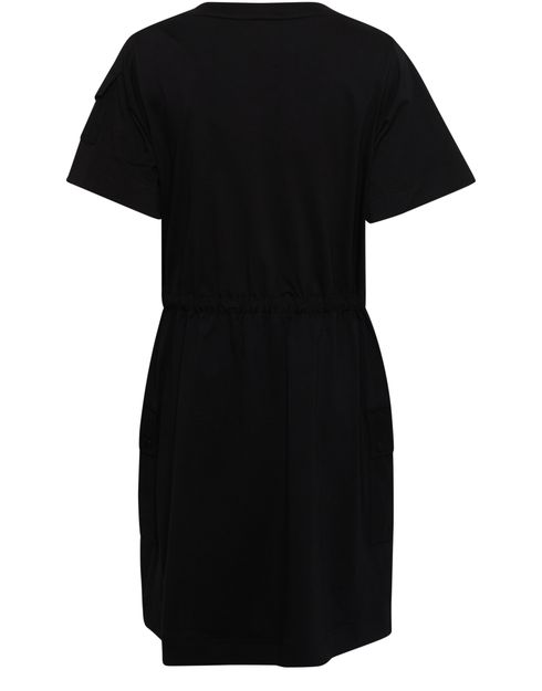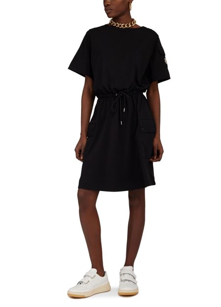 • Description : robe évasée, logo sur le côté, logo appliqué, mini robe, encolure ras du cou, manches courtes, poches à rabat, taille ajustable par cordon coulissant.