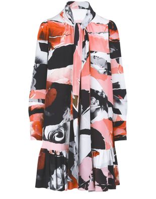 La coupe très courte et résolument féminine de cette robe en soie à manches longues signée Alexander McQueen est rehaussée par un imprimé aux couleurs marquées.