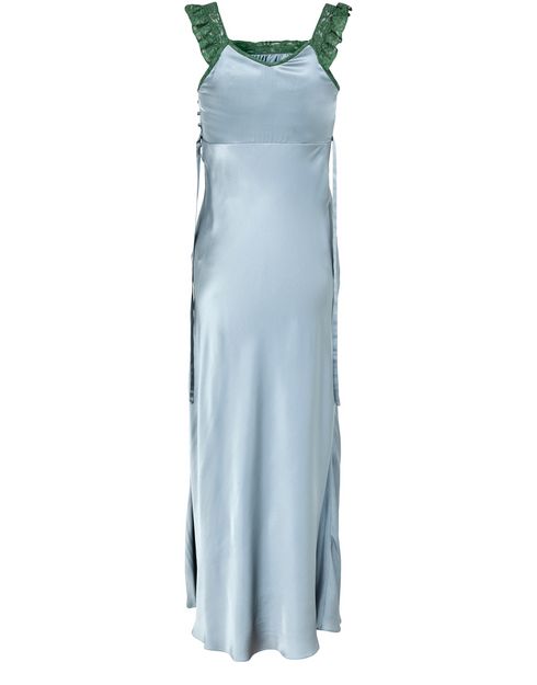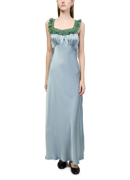 • Description : Robe longue, encolure rectangulaire, manche à volants, sans manches, fente sur le côté, détails dentelle.
