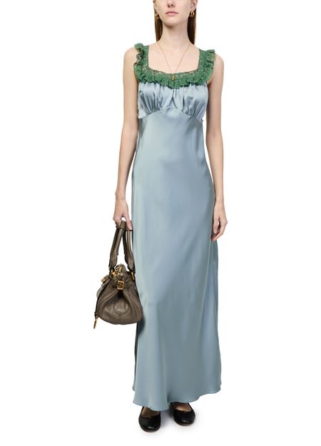 Découvrez la robe longue en satin Chloe, dotée d'une encolure rectangulaire et de manches à volants sans manches. Les détails en dentelle et la fente sur le côté subliment la silhouette, parfaite pour des soirées élégantes ou des événements raffinés. Un style contemporain assuré.