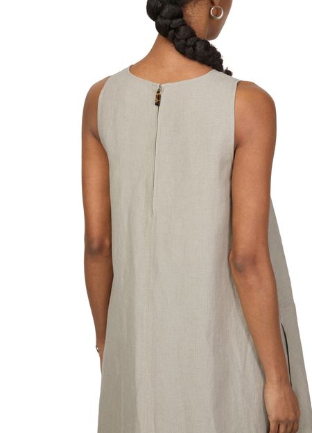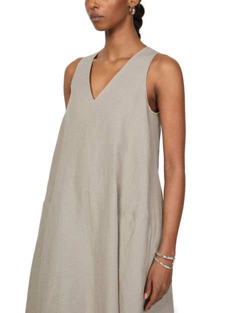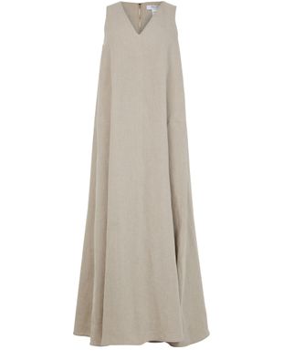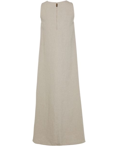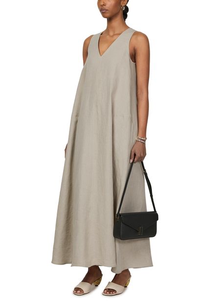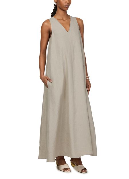 La robe longue évasée en lin Simeone de Max Mara incarne l'élégance intemporelle. Avec son col en v et sa fermeture à glissière dissimulée au dos, elle offre une silhouette parfaite. Les surpiqûres visibles et la coupe trapèze soulignent la délicatesse des manches courtes, tandis que le logo appliqué rehausse son charme.