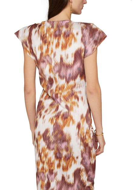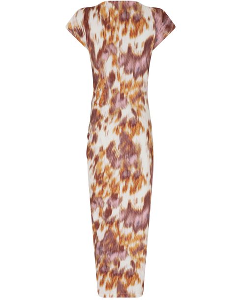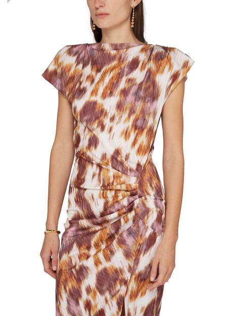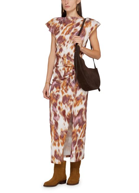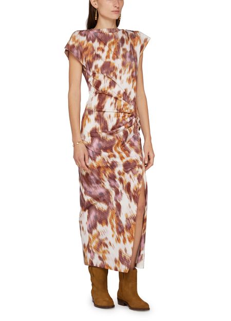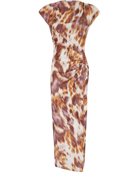 La robe longue Nadela d'Etoile Isabel Marant se distingue par son détail drapé et son imprimé all-over captivant. Avec une encolure montante et des manches courtes, elle offre une silhouette élégante. Les surpiqûres visibles et le logo appliqué ajoutent une touche raffinée, parfaite pour les soirées et cocktails. Une pièce incontournable.