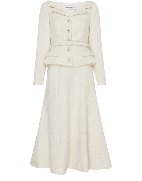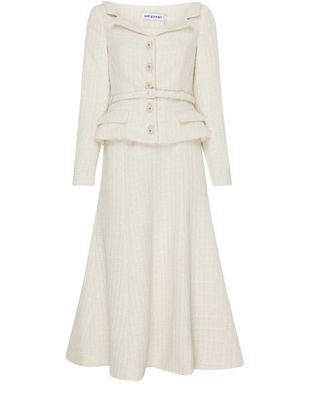 La robe midi ajustée bouclée de Self Portrait se distingue par ses boutons sur le devant et sa fermeture à bouton. Avec ses manches longues et son col en v, elle offre une silhouette élégante. Les deux poches avant et les poches à rabat ajoutent une touche pratique, tandis que l'étiquette avec logo à l’arrière souligne son caractère raffiné. Les détails plissés apportent une note...