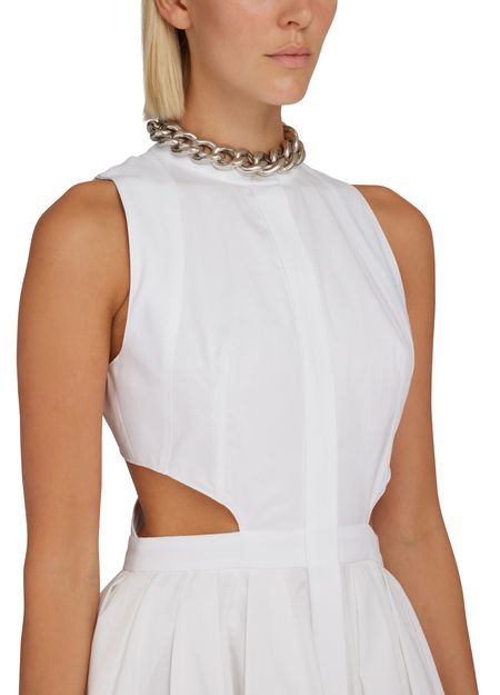 • Description : Robe évasée, longueur midi, encolure ras du cou, sans manches, découpes graphiques, détails plis et fronces.