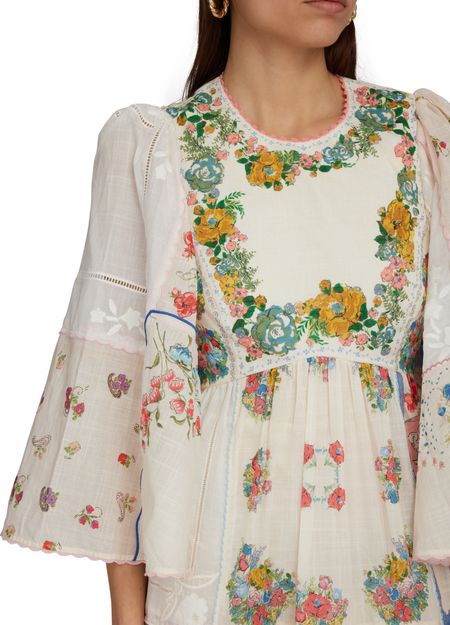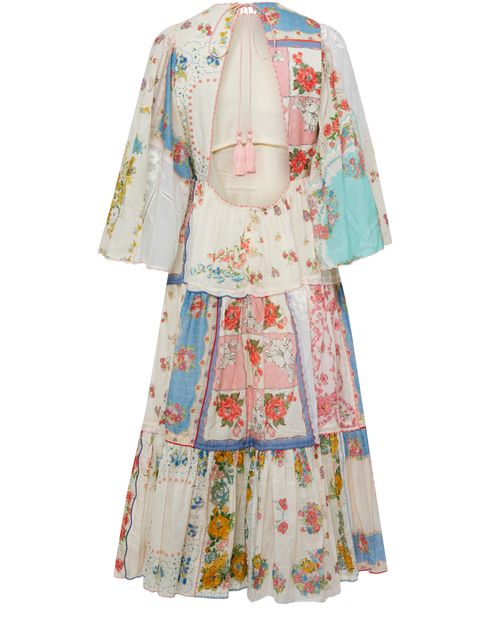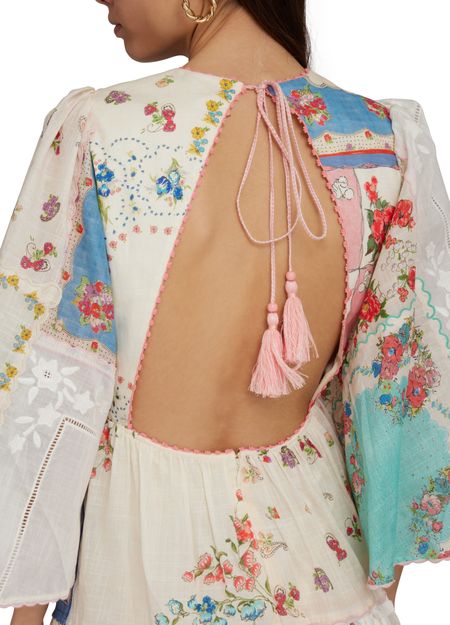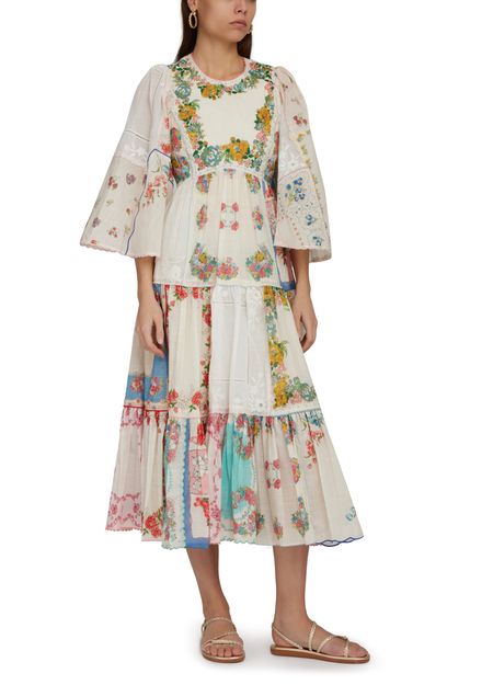 La Robe midi Clover Patched de Zimmermann est une robe évasée avec une encolure ras du cou et des manches trois-quarts. Elle possède un dos ouvert avec une fermeture à noeud et est ornée d'un motif fleuri, de détails pompon, ainsi que de plis et fronces.