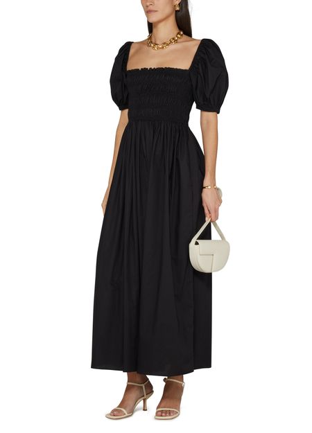 Description : robe longue, étiquette avec logo à l’arrière, robe évasée, manches courtes, encolure rectangulaire, détails plissés.