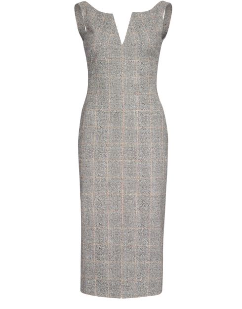 • Description : Robe midi, encolure en V, sans manches, fente à l'avant, coupe droite, taille soulignée.