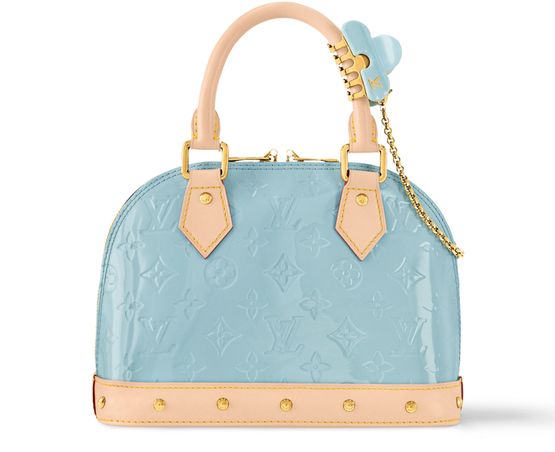 Doté d'une poignée supérieure et d'un dessous en cuir de vache naturel, ce sac Alma BB se distingue par sa forme Art déco réalisée en cuir brillant Monogram Vernis. La palette pastel, et les rivets dorés sur les supports de poignée et la garniture inférieure en cuir prêtent au modèle une allure contemporaine. Chaque pièce inclut une pince à cheveux de couleur assortie.