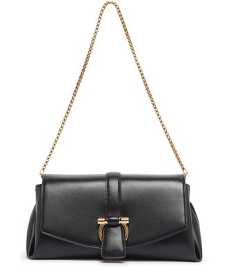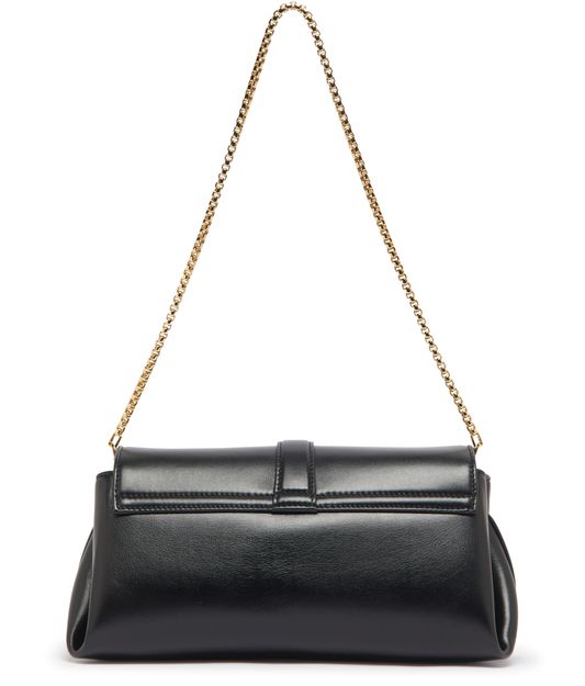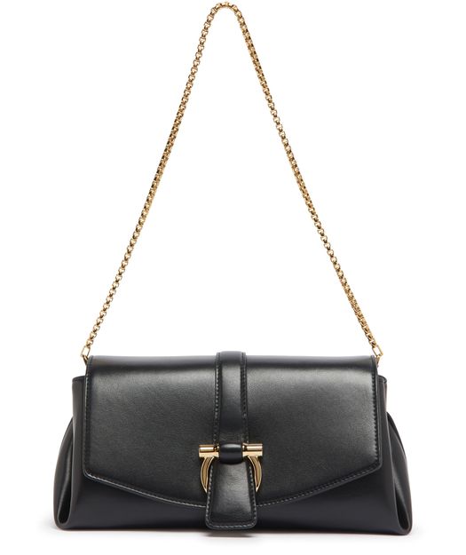 Le sac bandoulière Ferragamo allie élégance et praticité. Sa fermeture à rabat révèle un intérieur spacieux, tandis que les finitions dorées ajoutent une touche de luxe. Avec sa poignée unique et ses surpiqûres apparentes, il se porte à l'épaule ou en bandoulière chaîne, parfait pour une sortie chic.