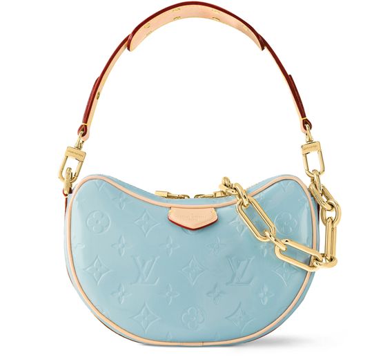 Confectionné en cuir de vache Monogram Vernis brillant discrètement embossé du motif Monogram, ce sac Croissant PM présente une allure résolument glamour. L'effet est accentué par le coloris pastel et la chaîne dorée amovible. L'intérieur comporte une poche plate, tandis que la bandoulière amovible non ajustable permet un porté court à l'épaule.