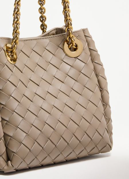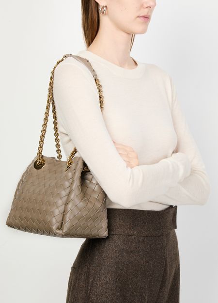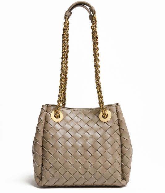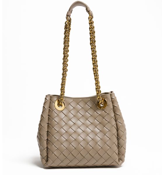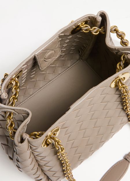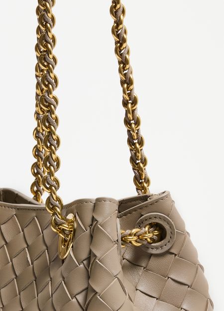 Le petit sac avec chaîne Parachute de Bottega Veneta allie élégance et praticité. Son fermoir aimanté sécurise un compartiment unique, tandis que les finitions dorées et les surpiqûres apparentes soulignent son raffinement. Avec sa poignée double, il se porte à la main ou à l'épaule grâce à sa bandoulière chaîne décorative.