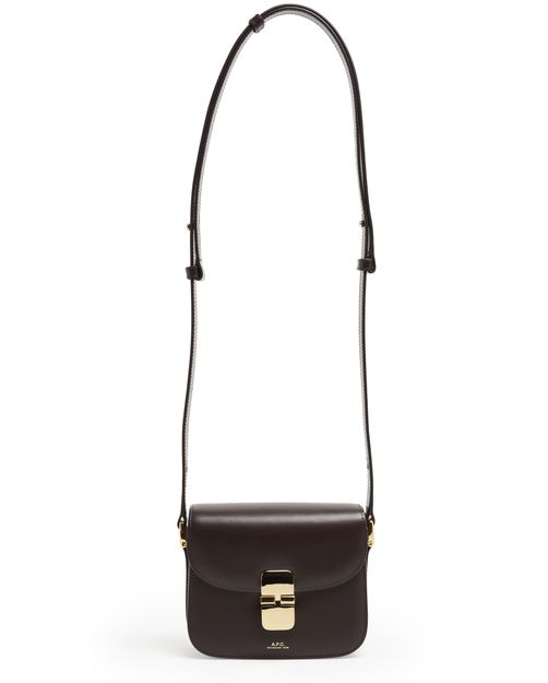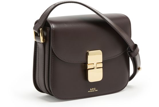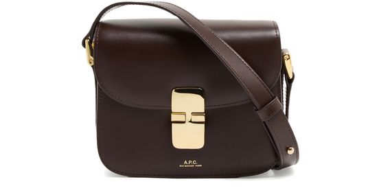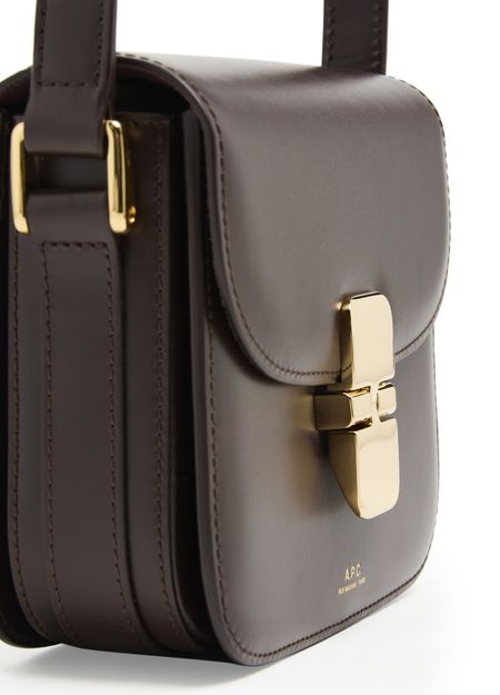 Le sac Grace mini d'APC incarne l'élégance discrète. Sa fermeture à rabat s'ouvre sur un intérieur raffiné, tandis que les finitions dorées et le logo en lettres dorées à l'avant ajoutent une touche de luxe. Avec sa poignée unique et sa bandoulière ajustable, il se porte croisé avec style.