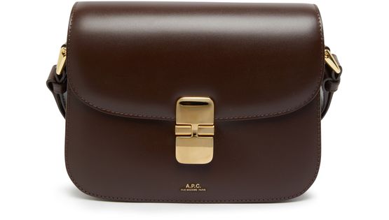 Le sac Grace Small d'APC est un accessoire élégant et polyvalent. Avec son logo en lettres dorées imprimé à l'avant, sa fermeture à rabat et ses finitions dorées, ce sac est parfait pour un look chic. Il peut être porté à la main ou à l'épaule, grâce à sa bandoulière fine et ajustable, et sa poignée unique.