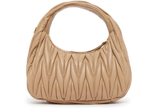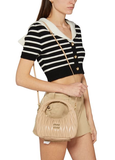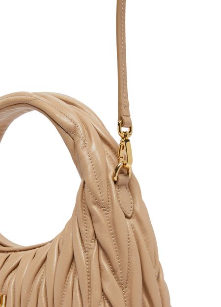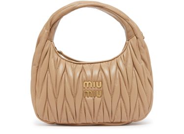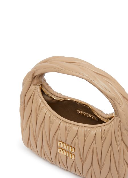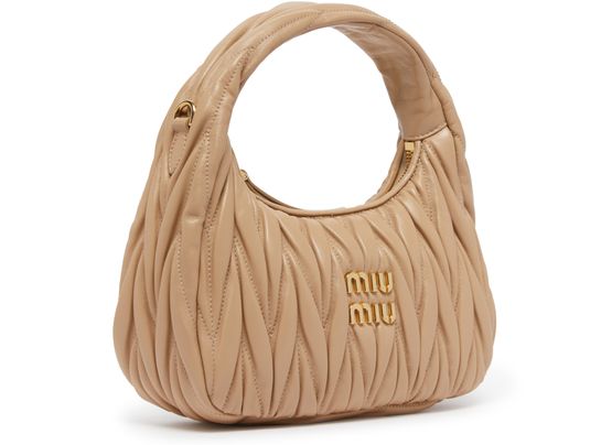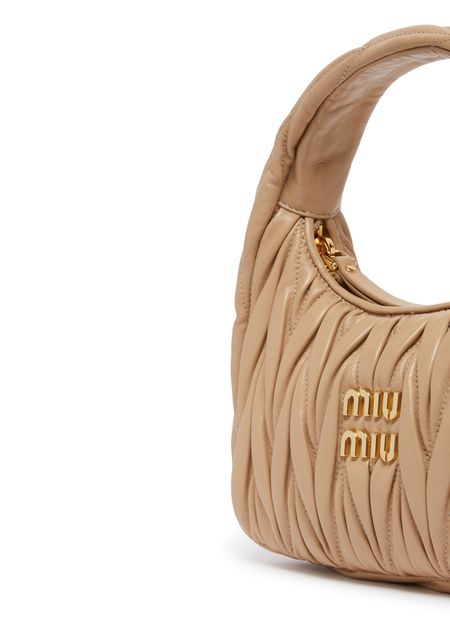 Le sac hobo Miu Wander de Miu Miu est confectionné en cuir à chevron matelassé avec un logo métallique à l'avant. Il présente un logo en lettres dorées, une poignée unique pour un porté main ou croisé, une fermeture à glissière et des finitions dorées. Sa texture capitonnée lui confère une allure élégante.