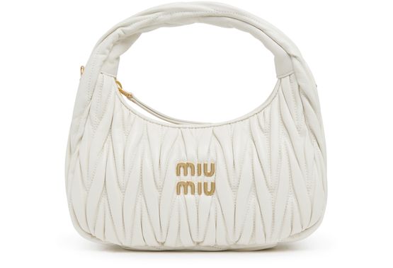Le sac hobo Miu Wander de Miu Miu est confectionné en cuir à chevron matelassé avec un logo métallique à l'avant. Il présente un logo en lettres dorées, une poignée unique pour un porté main ou croisé, une fermeture à glissière et des finitions dorées. Sa texture capitonnée lui confère une allure élégante.
