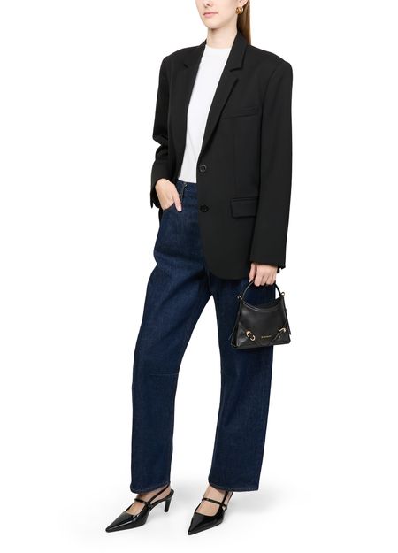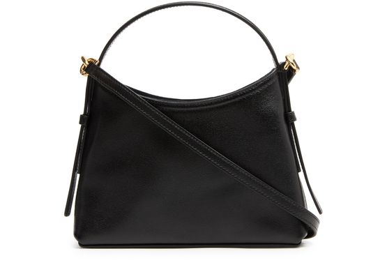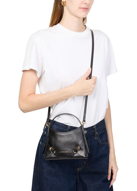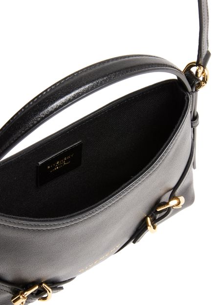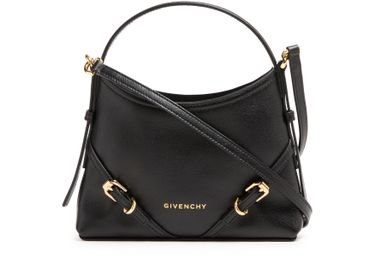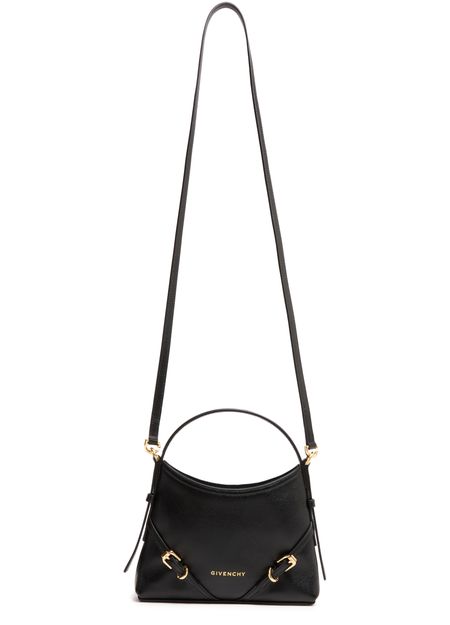 Découvrez le sac nano Voyou en cuir brillant de Givenchy, une œuvre d'art en cuir lisse. Ce modèle élégant dispose d'une poignée unique et d'une bandoulière fine ajustable pour un port polyvalent. Le logo à l'avant en lettres dorées ajoute une touche de sophistication, tandis que les surpiqûres apparentes soulignent son design exquis.