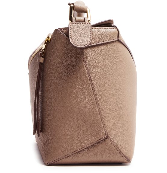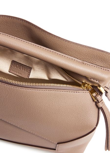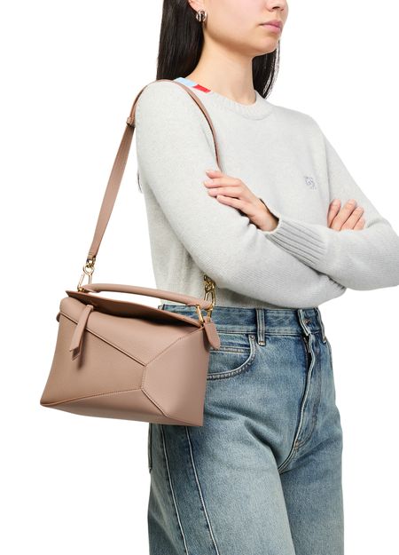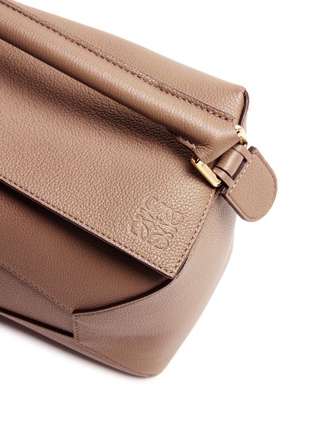 Découvrez le Puzzle Edge petit sac en cuir de veau grainé souple Loewe, confectionné en cuir grainé doux et orné de finitions dorées. Sa bandoulière fine, ajustable et amovible, ainsi que la poignée unique, offrent une allure moderne. Le médaillon Anagram et le logo à l'avant signent son style raffiné.