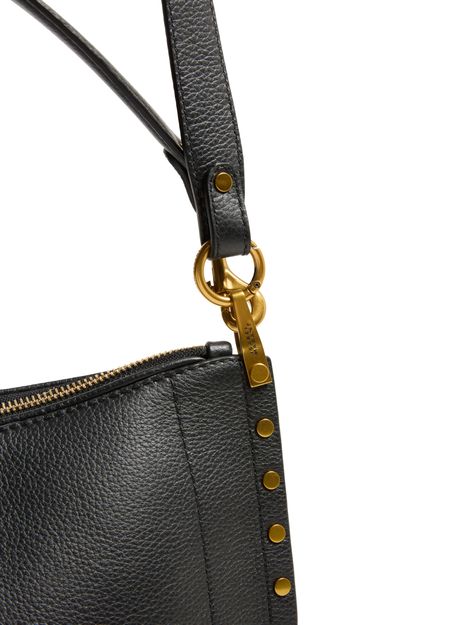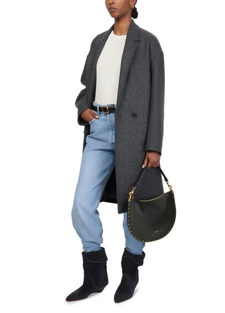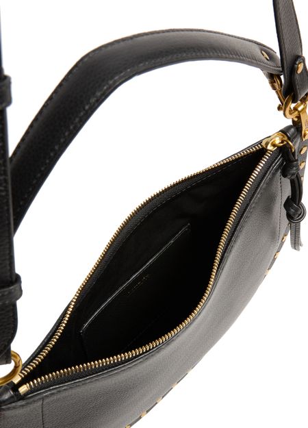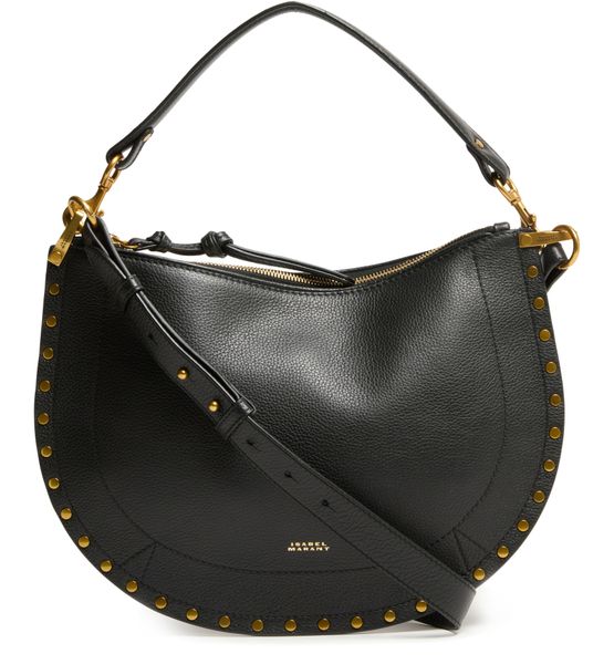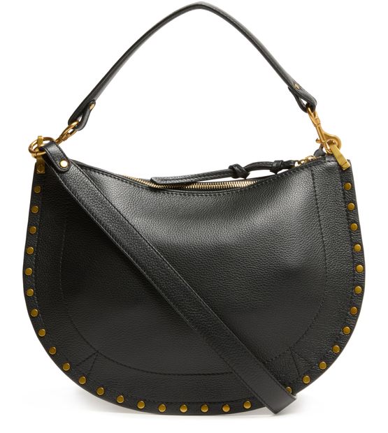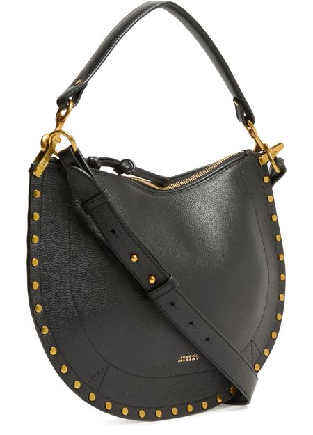 Découvrez le sac souple porté épaule Oskan d'Isabel Marant, une élégante alliance de cuir grainé et de détails de clous. Ce sac hobo présente une poignée unique et une bandoulière ajustable et amovible pour plus de polyvalence. Fentes pour cartes et compartiment unique complètent cet accessoire raffiné, rehaussé par un logo doré à l'avant.