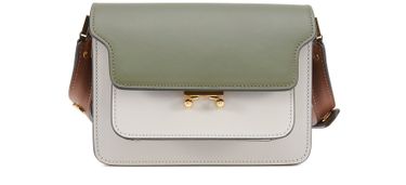 La maison Marni revisite son iconique sac Trunk. Cette version en cuir tricolore, sublimée de détails en laiton doré et d'une bandoulière en cuir cloutée se porte à l'épaule.