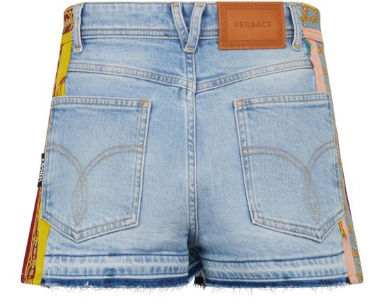 Indéniablement dans l'air du temps par son aspect délavé et ses bords bruts à fils coupés, ce short en jean orné latéralement de motifs Barocco est signé Versace.
