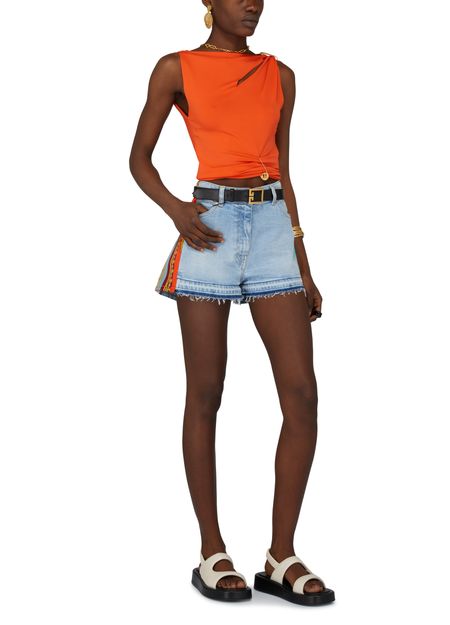 Description : Short court, passants pour ceinture, fermeture à glissière avec bouton, poches avant, empiècement latéral, surpiqûres apparentes, bords effrangés, finitions dorées.