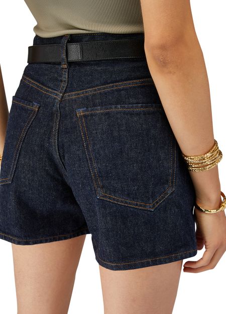 Description : Short court, coupe droite, bouton sur le devant, coutures contrastantes, style cinq poches, passants pour ceinture, logo brodé, fermeture dissimulée.