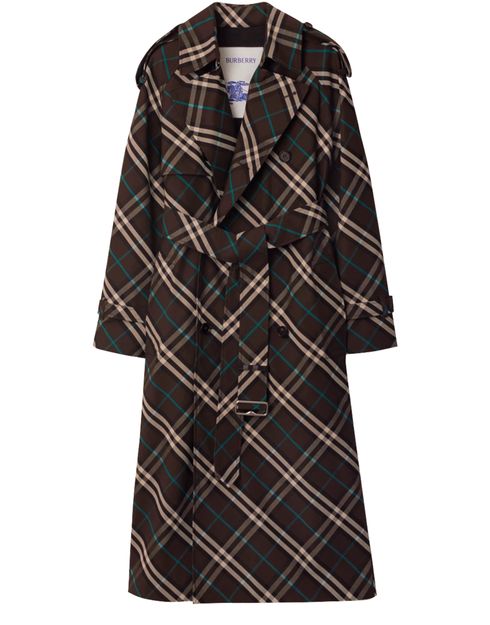 • Description : double boutonnage, motif à carreaux, étiquette avec logo à l’arrière, long, poches latérales, trench, manches longues.