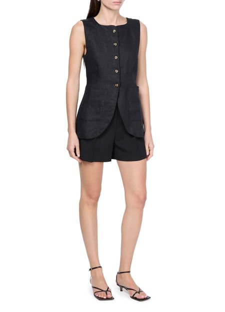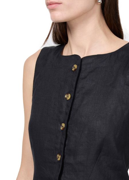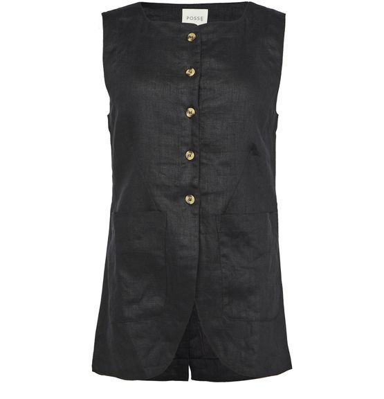 Description : boutons sur le devant, logo appliqué, surpiqûre visible, classique, deux poches avant, poches plaquées, sans manches, encolure rectangulaire, chemisiers & blouses, fente à l'arrière.