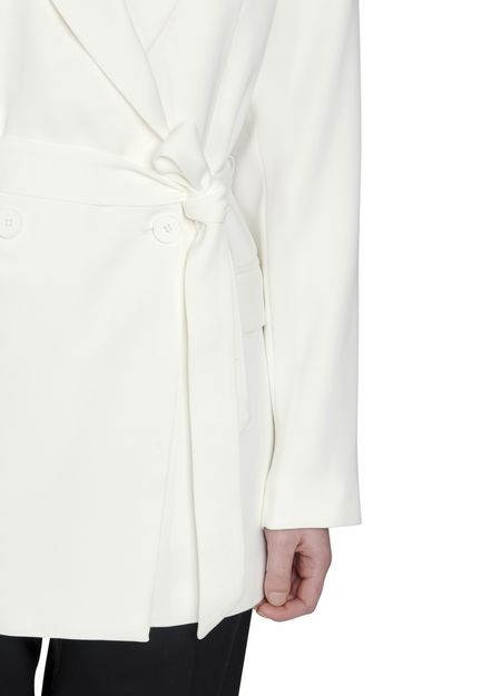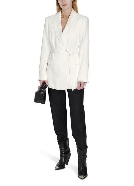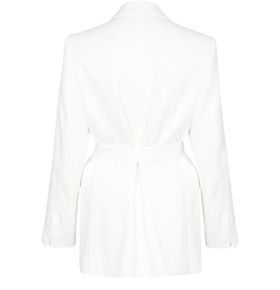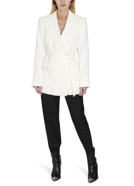 Description : Col tailleur en pique, poches à rabat, taille ceinturée, fermeture croisée.