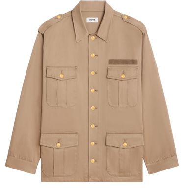 La veste saharienne en coton technique de Celine incarne l'élégance décontractée. Son porté oversize et son col chemise apportent une allure contemporaine. Dotée de deux pattes d'épaule et de quatre poches plaquées, elle se distingue par son détail velcro poitrine. Les boutons Triomphe ajoutent une touche raffinée, parfaite pour toute occasion.