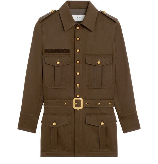 La veste saharienne en laine diagonale de Celine incarne l'élégance intemporelle. Son porté classique, avec un col chemise, se distingue par ses deux poches poitrine plaquées à rabat et ses deux poches plaquées à rabat. La ceinture en tissu avec boucle métallique accentue la taille, tandis que les boutons Triomphe ajoutent une touche distinctive. Fabriquée en Italie, cette pièce raffinée est un must-have pour toute...