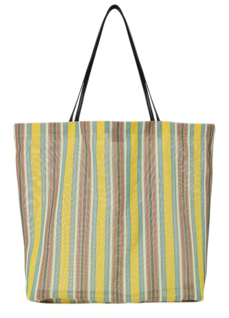 説明 : Shopper / tote bag, striped print, double handles, thin strap, detachable interior purse, single compartment, large interior compartment.