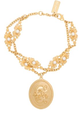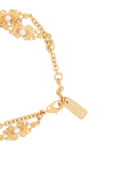Introducing Chloe's charm bracelet, a stunning piece adorned with exquisite bead and pearl details. The gold finish adds a touch of elegance, while the snap-hook closure ensures a secure fit. Perfect for elevating any ensemble with its modern allure.