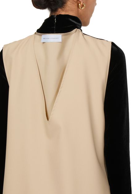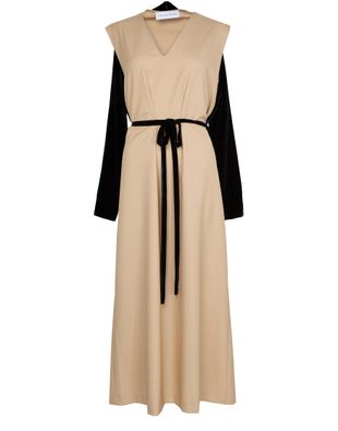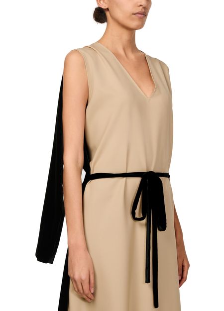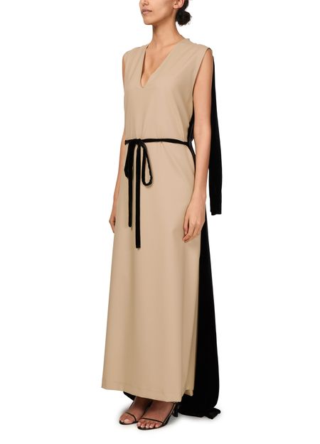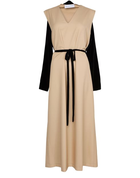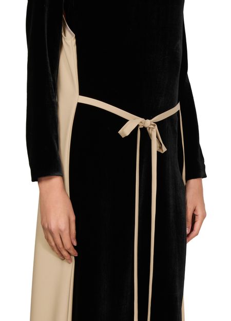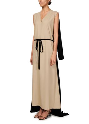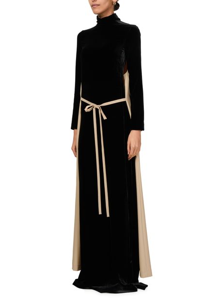 Experience Marie Adam Leenaerdt Chasuble Evening Dress, featuring a chic V-neck and long sleeves. The bow fastening adds a touch of elegance, making it perfect for any occasion.