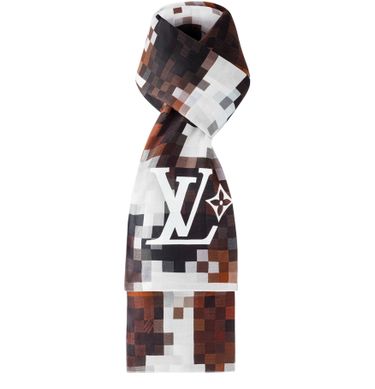 Featuring a standout motif from the Fall-Winter 2024 Show, this Cowmooflage Stole will energize any ensemble. Crafted in a cotton-silk blend, it features an audacious twist on the heritage Damier, playfully reinterpreted in pixelated cowhide tones. Marque L.Vuitton Déposée signatures are discreetly integrated into the motif, while a contrasting white LV Lovers signature adorns one end.