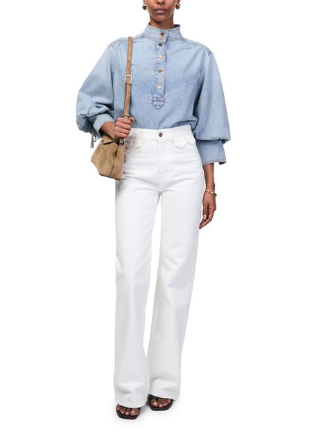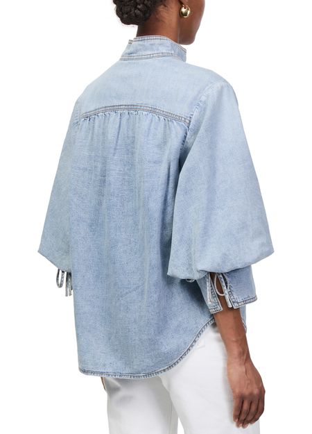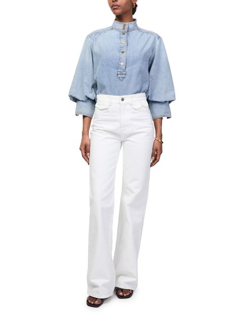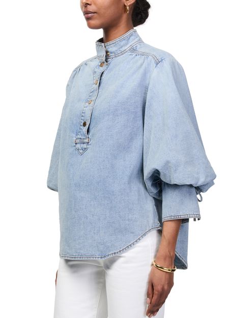 Reveal Zimmermann's denim blouse, crafted from premium denim with a high-neck silhouette and three-quarter sleeves. The front buttoned closure and contrast stitching add a refined touch, making this top a versatile choice for both casual and elevated ensembles.