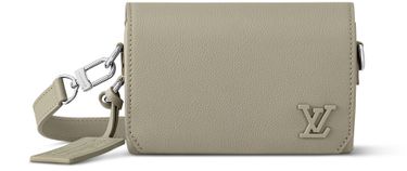 グレイン(しぼ)のあるカウハイドレザーにシルバーカラーのメタルパーツをあしらった「ファストライン・ウェアラブル ウォレット」。コーナー部分を斜めにカッティングしたフラップや、フロントのコーナーを彩るさりげないLV イニシャルなど、「アエログラム」コレクションならではのディテールを散りばめました。取外し可能なストラップで、さまざまな持ち方をお楽しみいただけます。