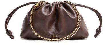Introducing Loewe's Medium Flamenco bag in mellow nappa lambskin. This timeless shoulder bag is crafted from smooth leather, featuring a chain strap for versatile wear. The elegant drawstring closure, single compartment, and visible topstitching highlight Loewe's craftsmanship. Adorned with a front logo in gold letters and finished with gold accents, it's an exquisite choice for any occasion.
