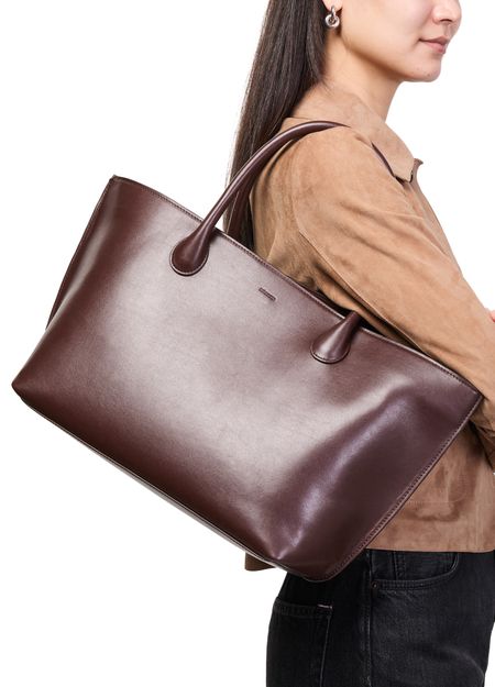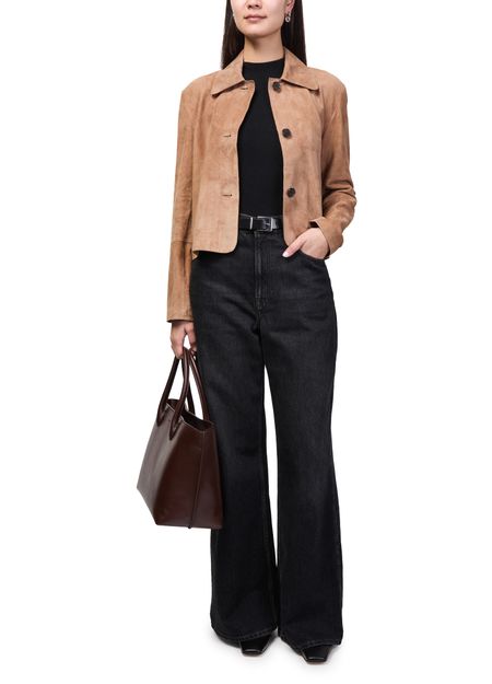 Reveal Lie Studio's Grace tote bag, crafted from sumptuous suede with double handles for effortless carrying. The spacious interior compartment and zippered pocket offer practical organization, while the silver clasp and engraved logo add a refined finish. Visible topstitching highlights the bag's contemporary design.