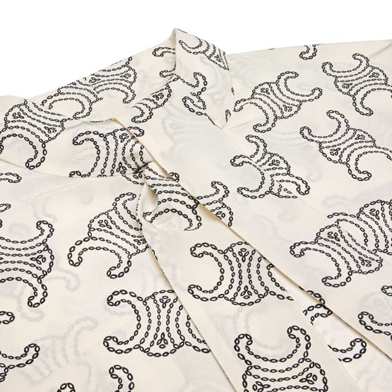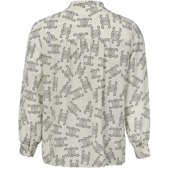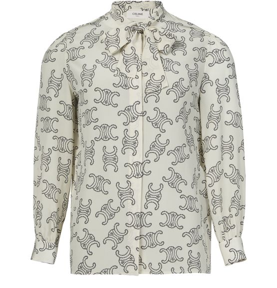Celine's lavallière blouse in crêpe de chine showcases an elegant design with a concealed closure and visible stitching. Its regular length and long-sleeved silhouette are complemented by cuffed sleeves and buttoned cuffs. The all-over print adds a touch of sophistication, while the lavaliere tie-neck enhances its timeless charm.