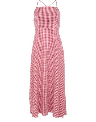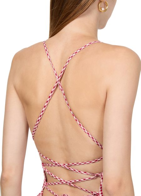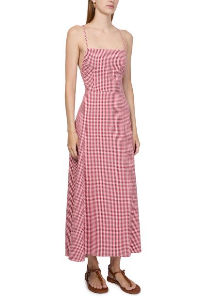 Introducing Posse's Lori long dress, a captivating piece with a checked pattern that defines its graceful midi length. The rectangular neckline and sleeveless design enhance its elegant silhouette. Crafted with a unique bow fastening and featuring a backless detail, this dress is perfect for chic occasions.