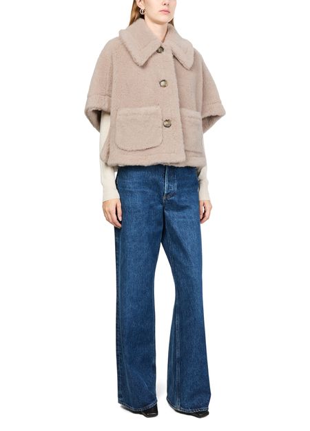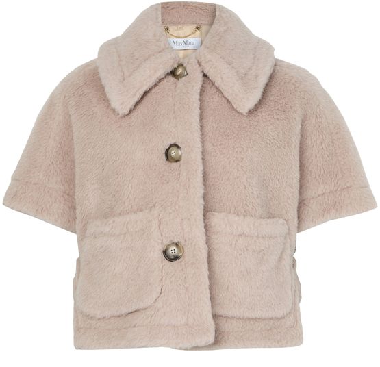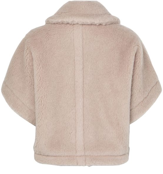 Introducing Max Mara's Newterzo Teddy cape, a modern take on knitwear. This piece features a chic button fastening and fur detail, offering a luxurious texture. The crop length and short, dropped sleeves create an elegant silhouette, perfect for elevating any ensemble with sophisticated flair.