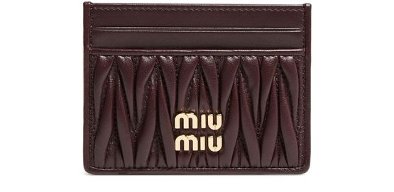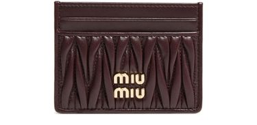 Reveal Miu Miu's quilted leather cardholder, crafted with sophistication. The elegant cardholder features metallic 'miu miu' lettering, a signature quilted herringbone detail, and smooth leather with visible topstitching. The front logo and gold finish add a luxurious touch, while the padded texture ensures a refined feel.