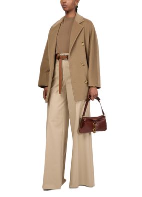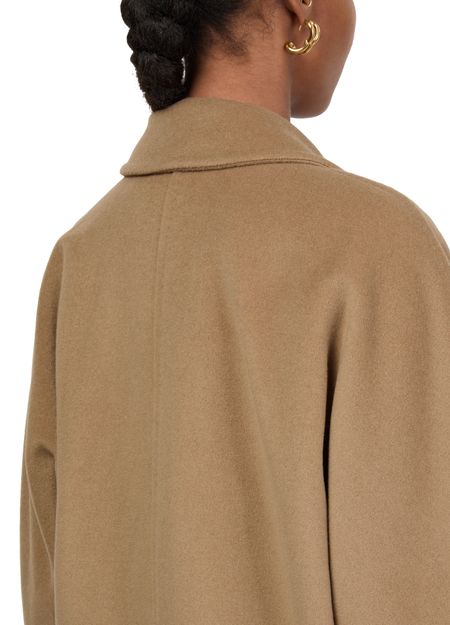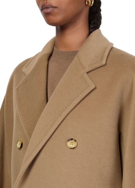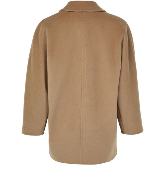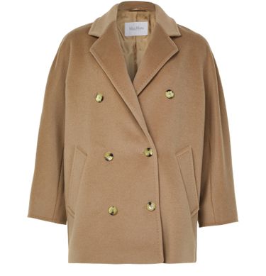 Unveil Max Mara's Rebus coat, distinguished by its boxy fit and short length, offering a modern silhouette. This double-breasted piece features welt pockets and a classic collar, perfect for various occasions. The short sleeves and structured design make it both functional and stylish, embodying a refined elegance.