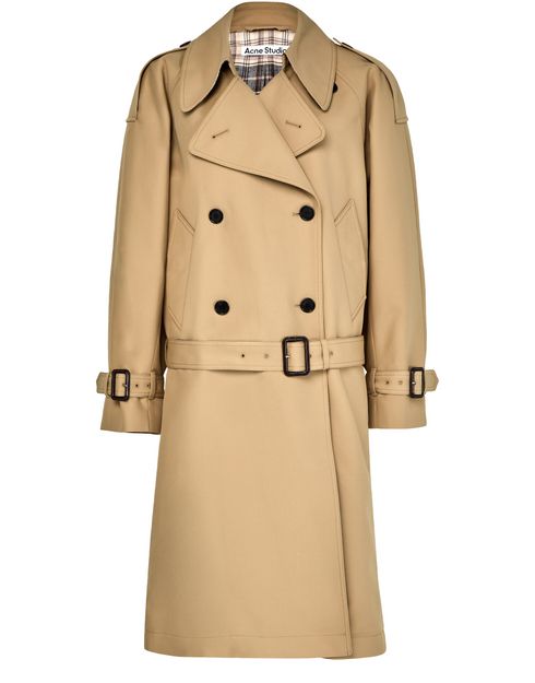 Unveil Acne Studios' satin trench coat, a timeless piece in a regular fit that exudes sophistication. This long, double-breasted coat features a classic collar and flap pockets, combining elegance with functionality. Perfect for any setting, its versatile design ensures a stylish look wherever you go.