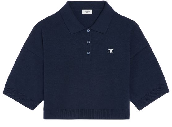 Discover Celine's Triomphe cropped polo in wool with its elegant Triomphe embroidery. The loose fit and cropped length make it a modern staple, while the shirt collar and dropped shoulders add a touch of sophistication. Finished with three exquisite mother-of-pearl buttons, it's a wardrobe must-have.