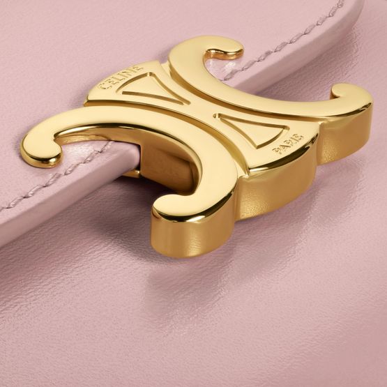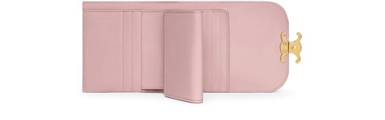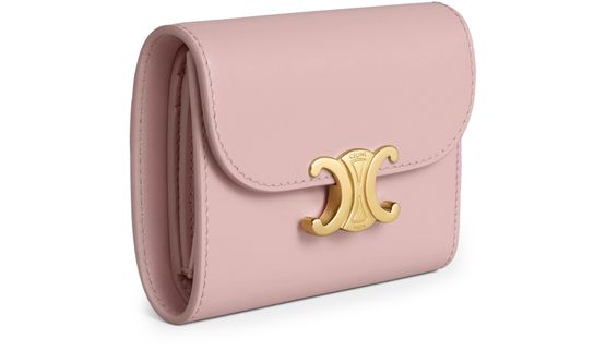Celine's Triomphe small flap wallet in shiny calfskin is a luxurious accessory that embodies elegance. With its gold finishing and a triomphe metallic snap button closure, it offers both style and functionality. Featuring a folded coin pocket, five credit card slots, a note pocket, and a flat pocket, it's perfect for the modern individual.