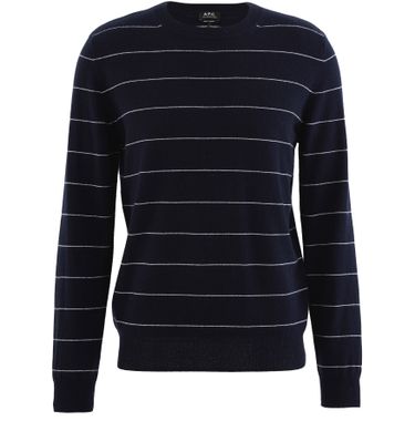 검은색 바탕에 가는 흰색 스트라이프가 있는 암브로즈(Ambrose) 스웨터 뒤에는 A.P.C.라는 세 글자가 새겨져 있습니다. 아페쎄(A.P.C)는 디테일을 중시하는 남성들을 위한 골지 라운드넥의 제품을 디자인합니다.