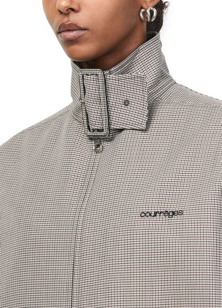 Reveal Courreges's buckle houndstooth bomber jacket, a short, modern silhouette with a high neck and long sleeves. The zipper and button fastening add a sleek touch, while welt pockets and an embroidered chest logo elevate its appeal. Perfect for versatile styling, from day to night.