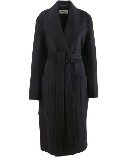 아크네 스튜디오(Acne Studios)의 카리스 코트입니다. 와이드 벨트와 오버사이즈 포켓으로 구성된 페미닌 컴퍼터블 모델입니다.